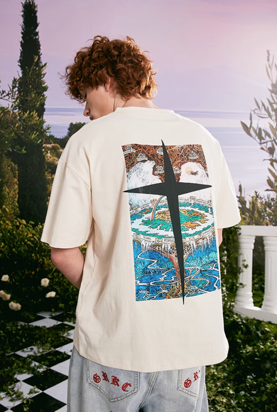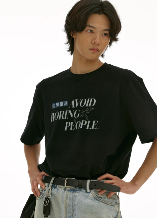 玩味十足的定制鞋,穿搭当然要呼应,选择同样玩味的“躲避无聊人”短袖 Tee,加上一条无惧夏日的高温战士微喇洗水牛,记得用上皮带,内扣上衣。妥妥的 Vibe 风穿搭。